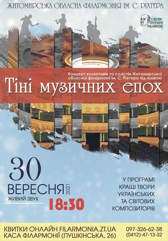 Концерт колективів та артистів Житомирської обласної філармонії «Тіні музичних епох». Шанувальники високого мистецтва поринуть у звуки музики кращих композиторів: від епохи середньовіччя до сьогодення. Отже, чекаємо вас, друзі, на наших дійствах!
