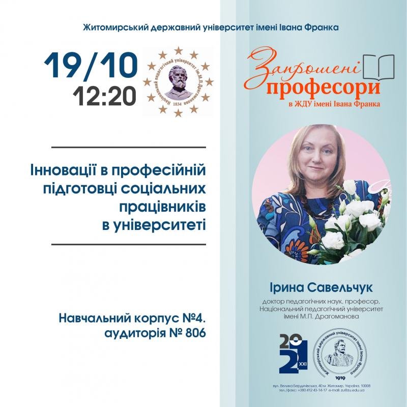 У рамках проєкту "Запрошені професори" в Житомирському Державному Університеті імені Івана Франка 19 жовтня о 12:20 в 806 аудиторії навчального корпусу №4 відбудеться відкрита лекція доктора педагогічних наук, професора Національного педагогічного університету імені М.П. Драгоманова - Ірини Савельчук.
