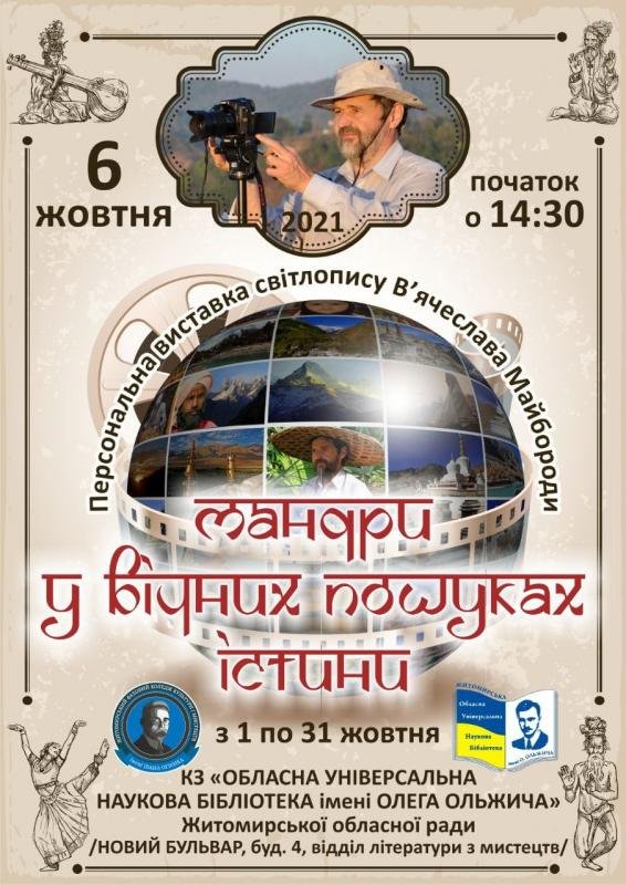 6 жовтня 2021 року відбудеться відкриття виставки фоторобіт відомого житомирського фотомайстра В’ячеслава Майбороди «Мандри у вічних пошуках істини».