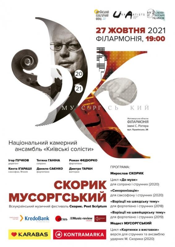 Знаковим моментом стане виконання славнозвісного циклу Модеста Мусоргського «Картинки з виставки». Версію цього твору для камерного оркестру та ансамблю з десяти ударних інструментів створив Мирослав Скорик. Цей масштабний задум, робота над яким тривала понад два роки, став його останнім великим творчим проєктом.