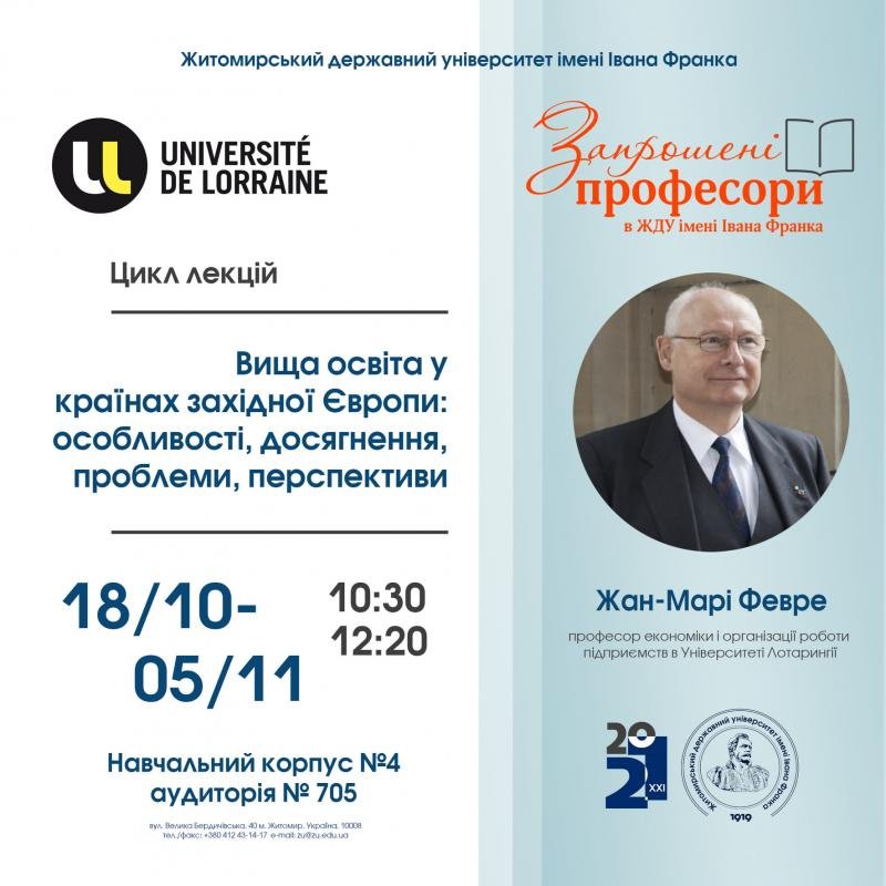 У рамках проєкту "Запрошені професори в ЖДУ імені Івана Франка" з 18 жовтня по 5 листопада відбудеться зустріч з професором економіки і організації роботи підприємств в Університеті Лотарингії Жаном-Марі Февре.