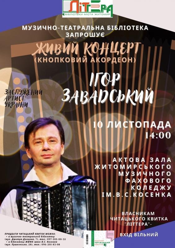 Запрошуємо усіх любителів живої музики на концерт відомого акордеоніста, заслуженого артиста України Ігоря Завадського