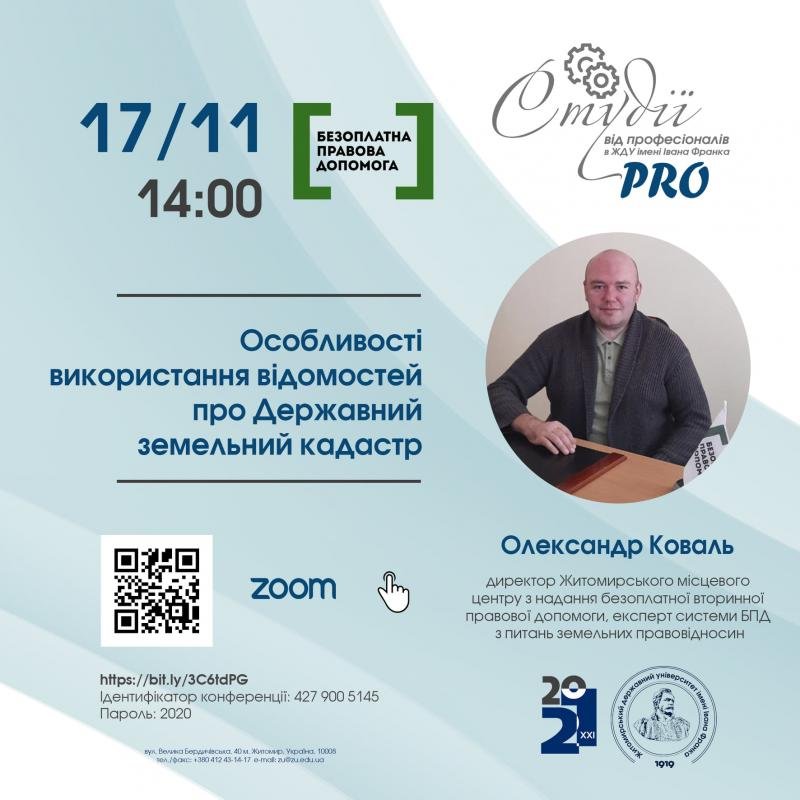 У рамках проєкт "PRO студії від професіоналів в ЖДУ імені Івана Франка" 17 листопада о 14:00 відбудеться зустріч з директором Житомирського місцевого центру з надання безоплатної вторинної правової допомоги, експерт системи БПД з питань земельних правовідносин - Олександром Ковалем.
