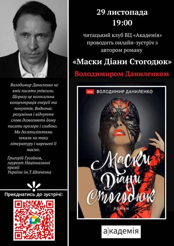 Запрошуємо на онлайн-зустріч з обговоренням роману "Маски Діани Стогодюк".