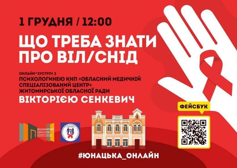 1 грудня 2021 року о 12:00 у Всесвітній день боротьби зі СНІДом в обласній бібліотеці для юнацтва відбудеться онлайн-зустріч «Що треба знати про ВІЛ/СНІД» за участі Вікторії Сенкевич, психолога КНП «Обласний медичній спеціалізований центр» Житомирської обласної ради.