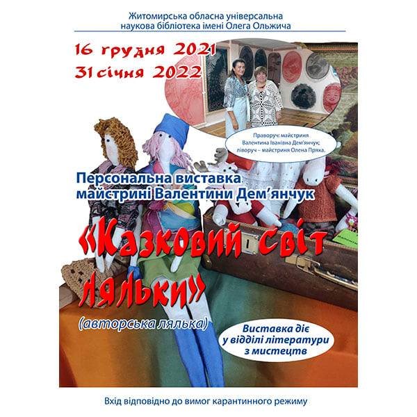 16 грудня 2019 року у відділі літератури з мистецтв Житомирської обласної універсальної наукової бібліотеки імені Олега Ольжича відкрилась відповідно до вимог карантину персональна виставка авторської ляльки (сучасна художня лялька) відомої майстрині декоративно-ужиткового мистецтва Житомирщини Валентини Іванівни Дем’янчук.