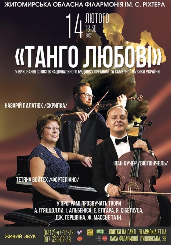 Виконавці — солісти Національного будинку органної та камерної музики України Іван Кучер (віолончель), Назарій Пилатюк (скрипка), Тетяна Войтех (фортепіано).