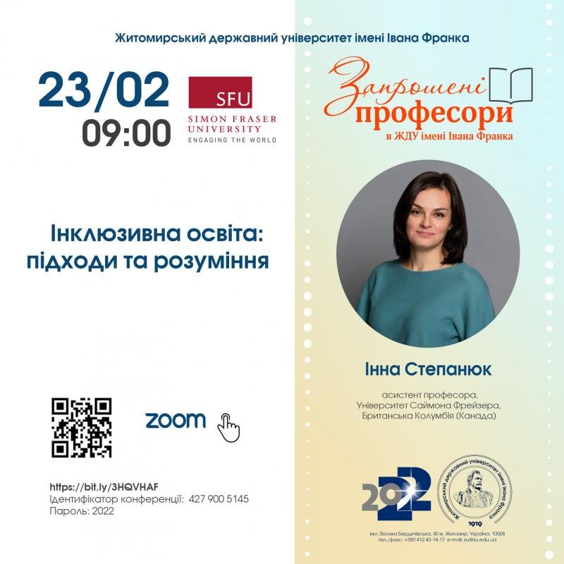 У рамках проєкту "Запрошені професори в ЖДУ імені Івана Франка" 23 лютого о 9:00 відбудеться відкрита лекція асистента професора Університету Саймона Фрейзера (Британська Колумбія, Канада) - Інни Степанюк.