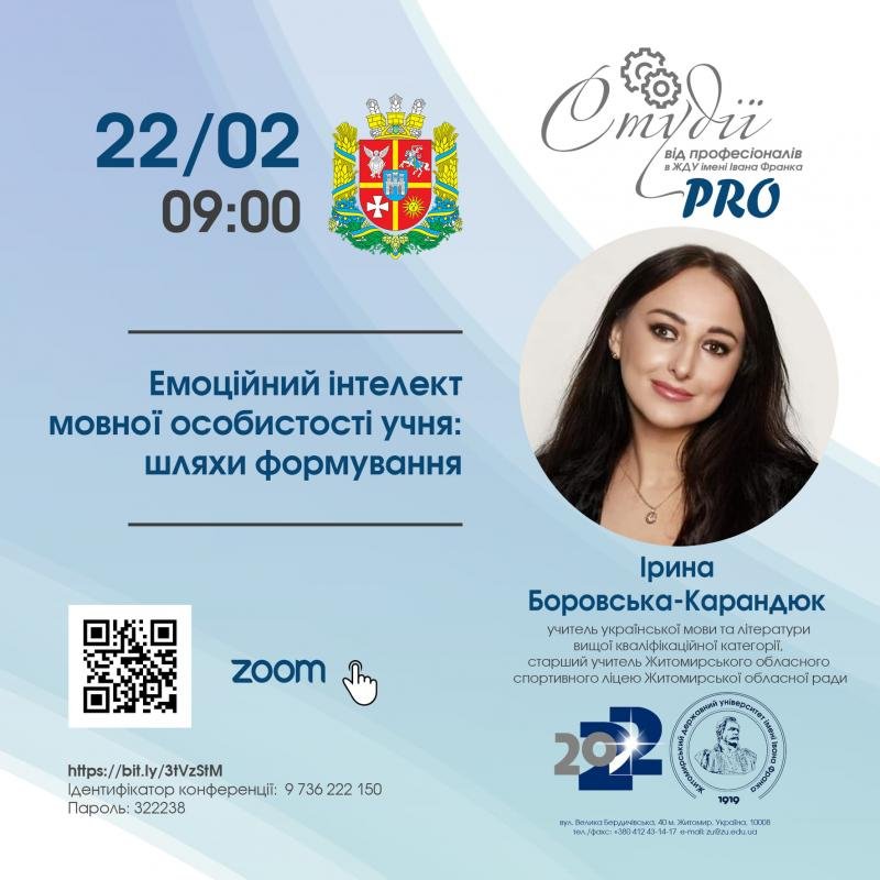 У рамках проєкту "PRO студії від професіоналів в ЖДУ імені Івана Франка" 22 лютого о 9:00 відбудеться зустріч з учителем української мови та літератури вищої кваліфікаційної категорії, старшим учителем Житомирського обласного спортивного ліцею Житомирської обласної ради - Іриною Боровською-Карандюк.
