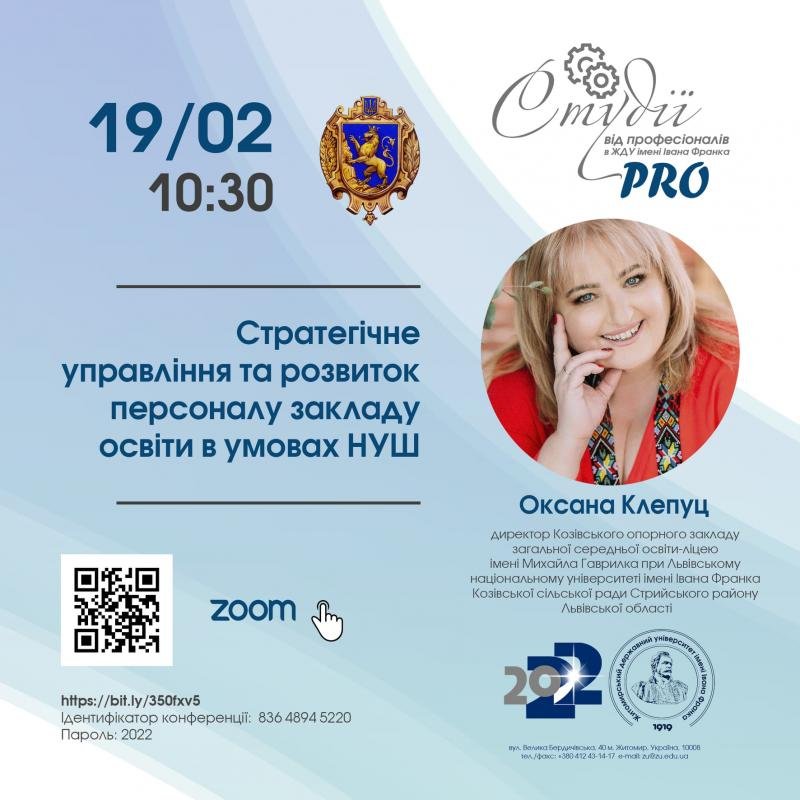 У рамках проєкту "PRO студії від професіоналів в ЖДУ імені Івана Франка" 19 лютого о 10:30 відбудеться зустріч директором Козівського опорного закладу загальної середньої освіти-ліцею імені Михайла Гаврилка при Львівському національному університеті імені Івана Франка Козівської сільської ради Стрийського району Львівської області - Клепуц Оксаною.