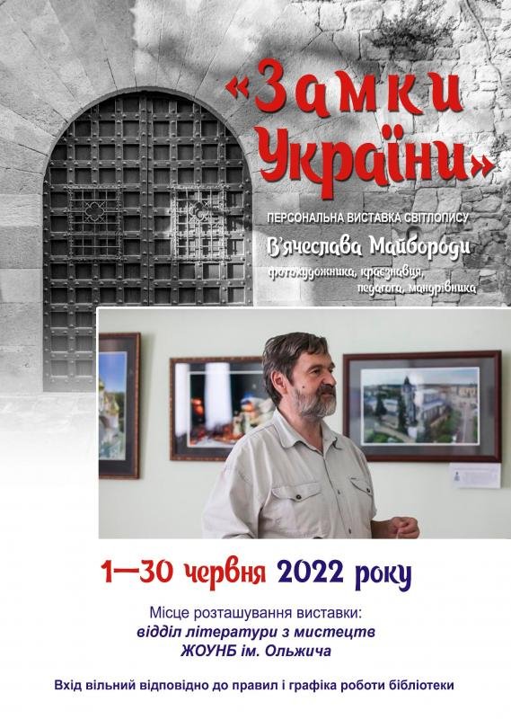 З 1 по 30 червня у відділі літератури з мистецтв бібліотеки експонуватиметься персональна виставка світлопису «Замки України» фотохудожника, краєзнавця, педагога, мандрівника В’ячеслава Майбороди.