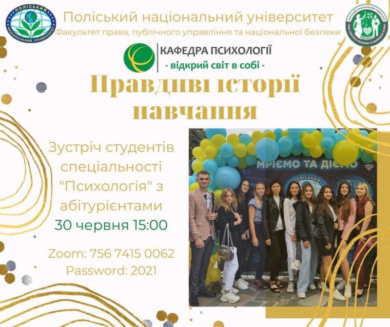 Запрошуємо вас 30 червня о 15:00 на «Правдиві історії навчання» від бакалаврів-психологів Поліського національного університету