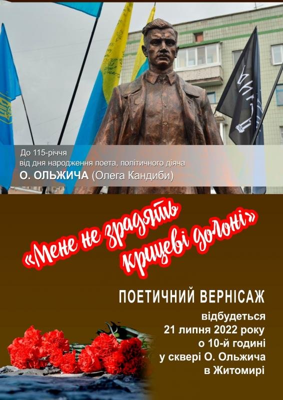 21 липня 2022 року до 115-річчя від дня народження поета, політичного діяча О. ОЛЬЖИЧА (Олега Кандиби) відбудеться поетичний вернісаж «Мене не зрадять крицеві долоні».