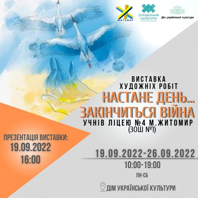 З А П Р О Ш У Є М О на виставку художніх робіт НАСТАНЕ ДЕНЬ... ЗАКІНЧИТЬСЯ ВІЙНА учнів Ліцею №4 м. Житомир (ЗОШ №1)