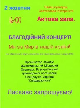 2 жовтня о 16:00 в актовій залі Палацу культури відбудеться благодійний концерт на підтримку наших Захисників, їх родин, ВПО родин.