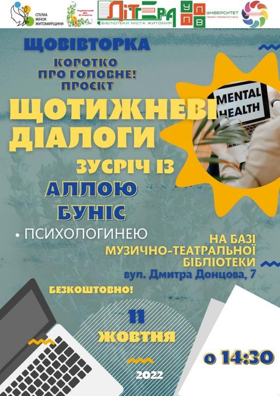 ЛІТтера - бібліотеки міста Житомира запрошують на зустріч із …  Аллою БУНІС - психологинею.