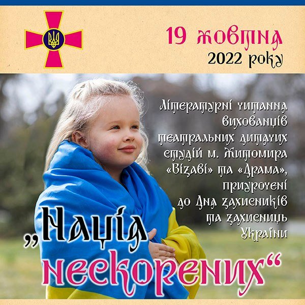 19 жовтня 2022 року у відділі літератури з мистецтв бібліотеки пройдуть літературні читання вихованців театральних дитячих студій м. Житомира «Візаві» та «Драма» «НАЦІЯ НЕСКОРЕНИХ».