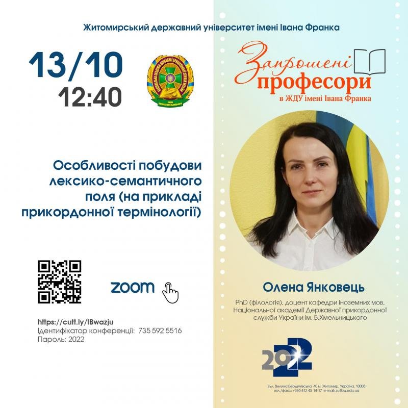 У рамках проєкту "Запрошені професори в ЖДУ імені Івана Франка" 13 жовтня о 12:40 відбудеться відкрита лекція доцента кафедри іноземних мов Національної академії Державної прикордонної служби України ім. Б.Хмельницького - Олени Янковець.
