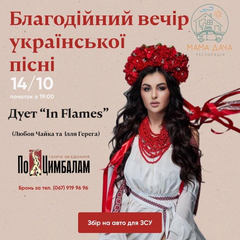 Саме у цей день дует «In flames» (Любов Чайка, Ілля Герега) та творче об’єднання «По цимбалам» проведе вечір української пісні для вас