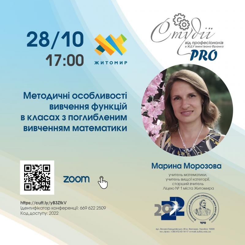 У рамках проєкту "PRO студії від професіоналів в ЖДУ імені Івана Франка" 28 жовтня о 17:00 відбудеться відкрита зустріч з учителем математики, учителем вищої категорії, старшим вчителем Ліцею № 1 міста Житомира - Мариною Морозовою.