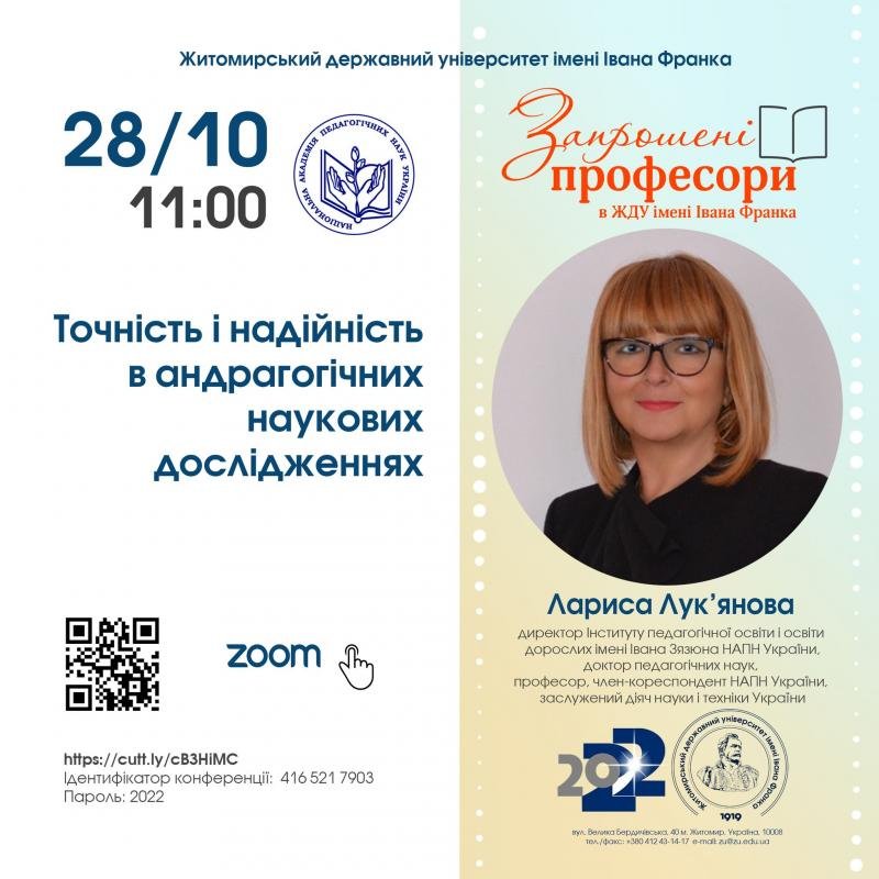 У рамках проєкту "Запрошені професори в ЖДУ імені Івана Франка" 28 жовтня о 11:00 відбудеться відкрита лекція докторки педагогічних наук, професорки, заслуженої діячки науки і техніки України, директорки інституту освіти і освіти дорослих імені Івана Зязюна НАПН України - Лариси Лук'янової.