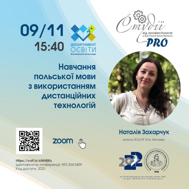 У рамках проєкту "PRO студії від професіоналів в ЖДУ імені Івана Франка" 9 листопада о 15:40 відбудеться відкрита зустріч з вчителем ЗОШ 10 м. Житомира - Наталією Захарчук.