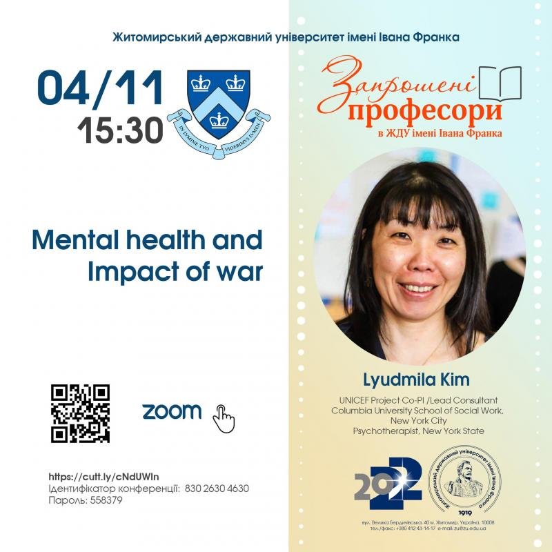 У рамках проєкту "Запрошені професори в ЖДУ імені Івана Франка" 4 листопада о 15:30 відбудеться старт онлайн тренінгів з можливістю сертифікації UNICEF Project Co-PI /Lead Consultant Columbia University School of Social Work, New York City Psychotherapist, New York State - Lyudmila Kim.