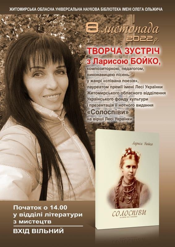 8 листопада 2022 року у відділі літератури з мистецтв відбудеться творча зустріч з ЛАРИСОЮ БОЙКО, композиторкою, педагогом, виконавицею пісень у жанрі «співана поезія», лауреатом премії імені Лесі Українки Житомирського обласного відділення Українського фонду культури і презентація її нотного видання «Солоспіви» на вірші Лесі Українки.
