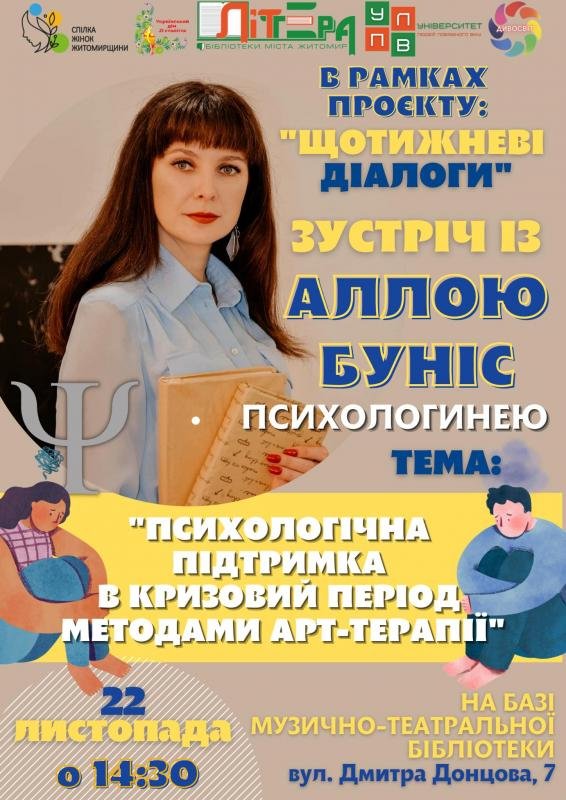 ЛІТтера - бібліотеки міста Житомира запрошують усіх бажаючих на зустріч із психологинею Аллою Буніс