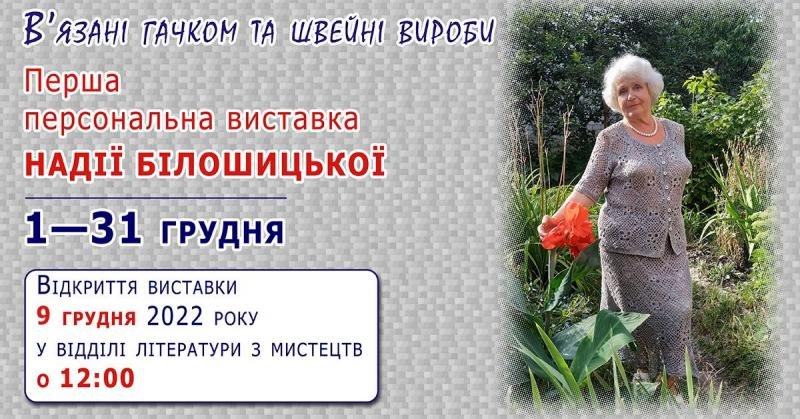 З 1 по 31 грудня 2022 року у відділі літератури з мистецтв працюватиме перша персональна виставка швейних та в’язаних гачком виробів майстрині Надії Білошицької під гаслом «Old school — завжди в тренді».