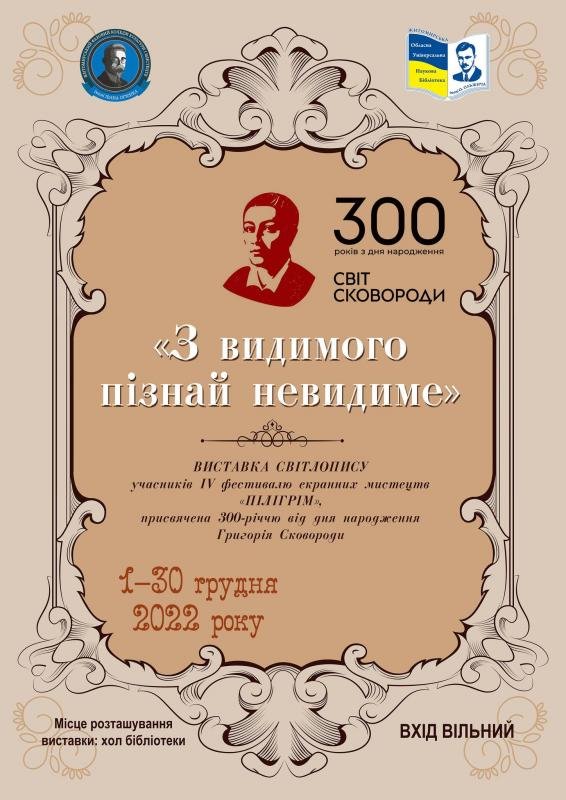 Житомирський фаховий коледж культури і мистецтв імені Івана Огієнка представляє виставку світлопису учасників IV фестивалю екранних мистецтв «Пілігрім», присвячену 300-річчю від дня народження Григорія Сковороди.