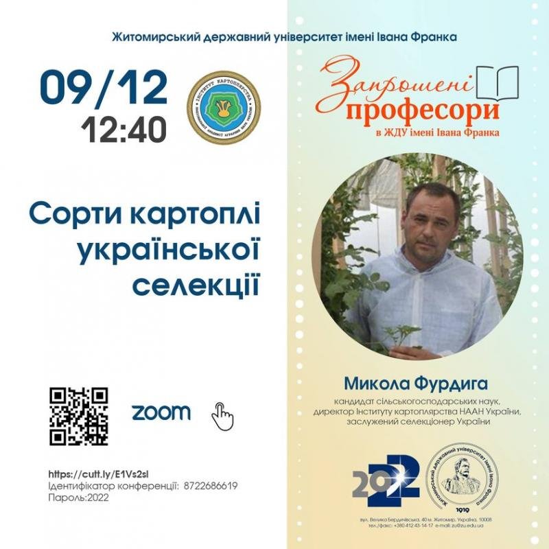У рамках проєкту "Запрошені професори в ЖДУ імені Івана Франка" 9 грудня о 12:40 відбудеться відкрита лекція кандидата сільськогосподарських наук, директора Інституту картоплярства НААН України, заслуженого селекціонера України - Миколи Фурдига.