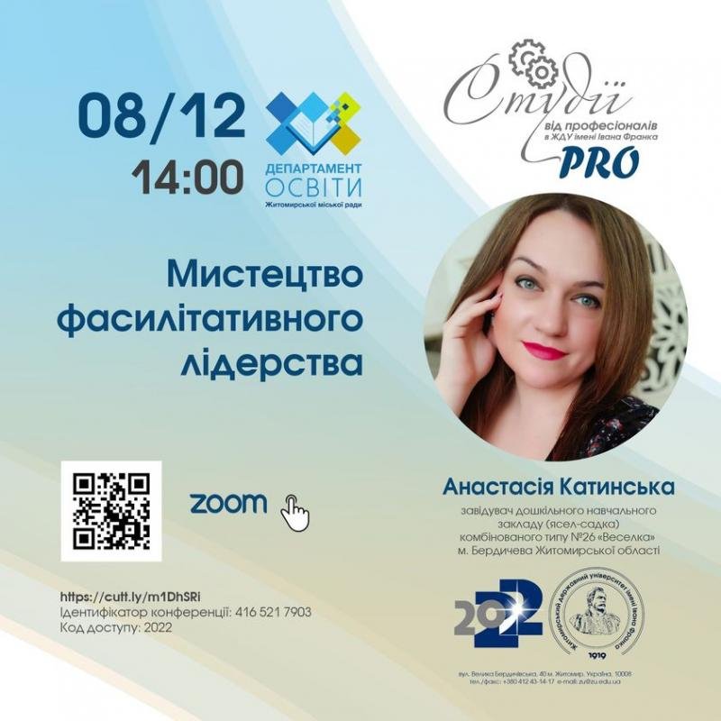 У рамках проєкту "PRO студії від професіоналів в ЖДУ імені Івана Франка" 8 грудня о 14:00 відбудеться відкрита зустріч з завідувачкою дошкільного навчального закладу (ясел-садка) комбінованого типу №26 «Веселка» м. Бердичева Житомирської області - Анастасією Катинською.