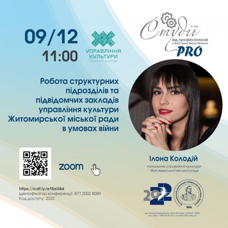 У рамках проєкту "PRO студії від професіоналів в ЖДУ імені Івана Франка" 9 грудня об 11:10 відбудеться відкрита зустріч з начальником управління культури Житомирської міської ради - Ілоною Колодій.