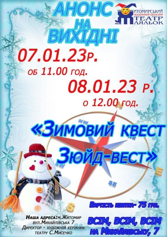 Запрошуємо відвідати святкову виставу "Зимовий квест Зюйд-вест" від Житомирського обласного академічного театру ляльок