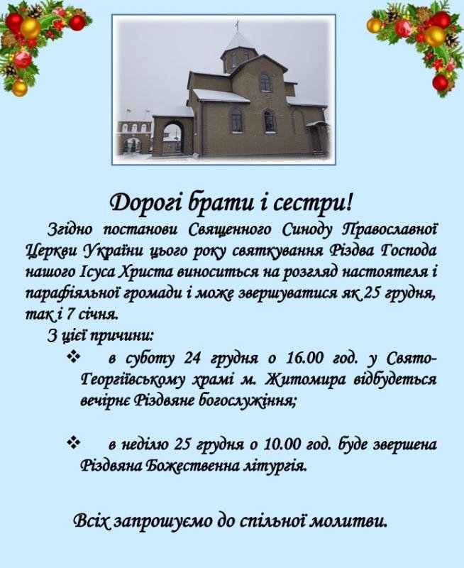 25 грудня. Різдвяна Божествена Літургія. Пчаток о 10:00
