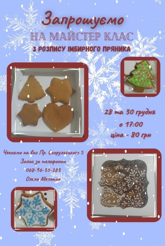 Друзі, запрошуємо гарно провести час 28 та 30 грудня на 17:00 розмалювати імбирні пряники.