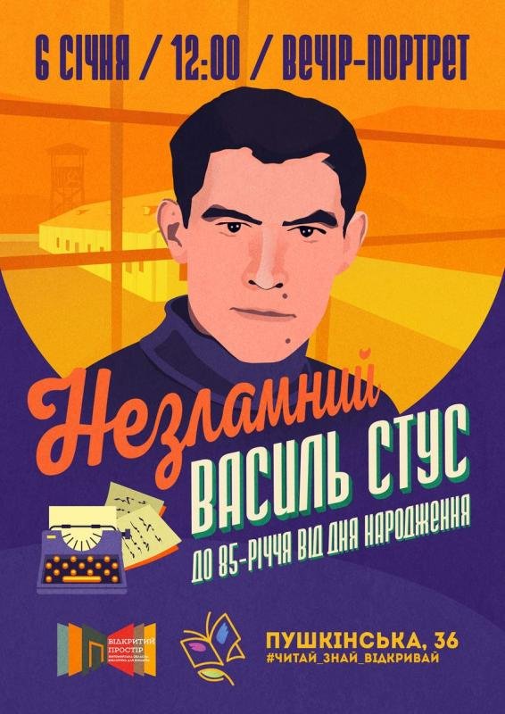 Запрошуємо на літературний вечір-портрет з нагоди 85-річчя від дня народження Героя України Василя Стуса. Згадаємо про незламну постать українського поета, перекладача, прозаїка, літературознавця, правозахисника, одного з найактивніших представників культурного руху шістдесятників.