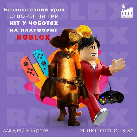 Запрошуємо ваших дітей і вас на безкоштовний пробний урок - Створення гри "Кіт у чоботях" на платформі ROBLOX