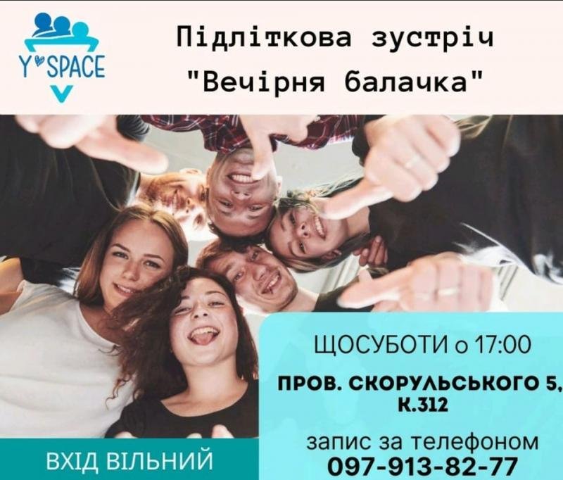 Запрошуємо підлітків від 12 років на безкоштовні зустрічі щосуботи о 17:00 в молодіжний гуманістичний простір Y'Space, за адресою пров. Скорульського, 5, де тренери пропонують дітям безпеку, прийняття, мотивацію та розвиток.