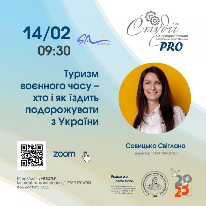 У рамках проєкту "PRO студії від професіоналів в ЖДУ імені Івана Франка" 14 лютого о 9:30 відбудеться відкрита зустріч з директором “SAVI TRAVEL” LLC - Світланою Савицькою.