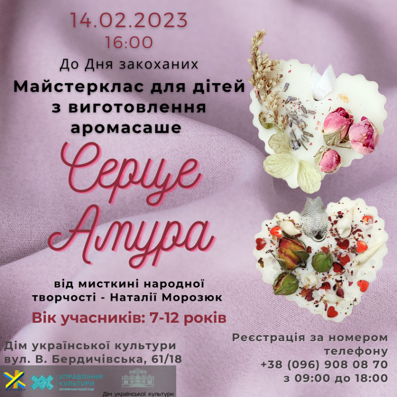 Запрошуємо діток віком від 7 до 12 років долучитися до крутецького майстеркласу «Серце Амура» з виготовлення аромасаше від мисткині народної творчості Наталії Морозюк.