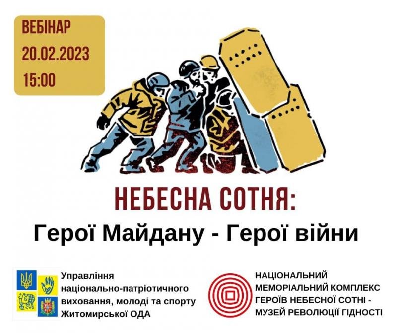 Управлінням національно-патріотичного виховання, молоді та спорту Житомирської ОДА спільно з Національним меморіальним комплексом Героїв Небесної Сотні-Музеєм Революції Гідності проводитиметься вебінар "Небесна Сотня: Герої Майдану-Герої війни".