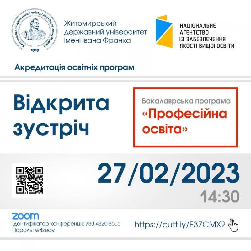 27 лютого о 14:30 в Житомирському державному університеті імені Івана Франка відбудеться відкрита зустріч з експертами Національного агенства забезпечення якості освіти України з приводу акредитації освітньої програми "Професійна освіта".