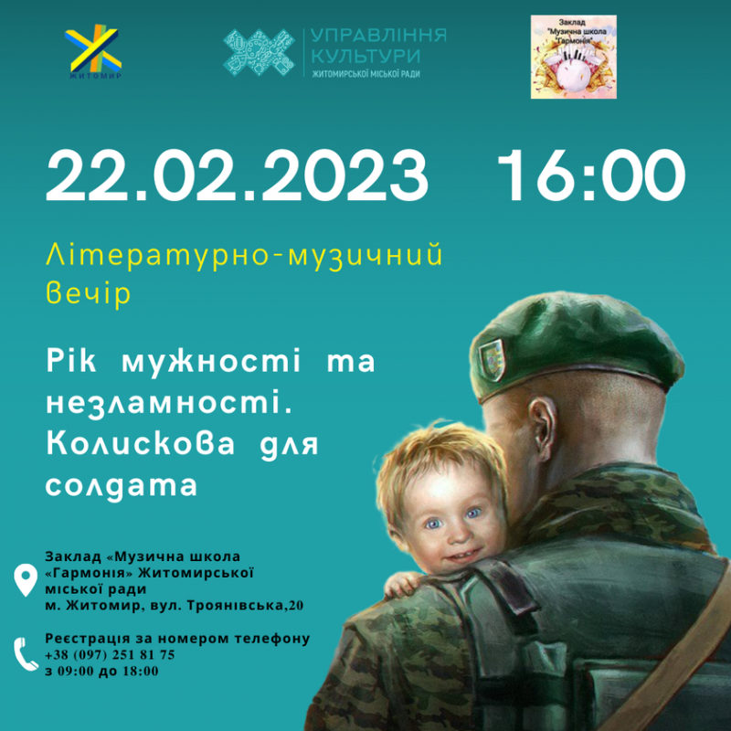 До річниці повномасштабного вторгнення росії на територію нашої держави заклад «Музична школа «Гармонія» Житомирської міської ради проводитиме літературно-музичний вечір «Рік мужності та незламності. Колискова для солдата».