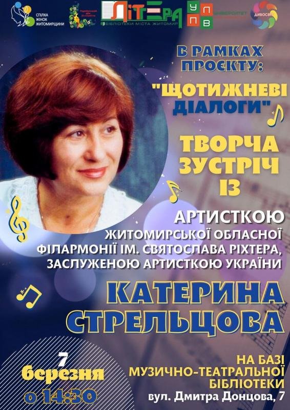 Кажуть, що зустрічі в нашому житті не випадкові, тож ЛІТтера - бібліотеки міста Житомира запрошують на творчу зустріч із Катериною Стрельцовою, артисткою Житомирської обласної філармонії ім. С. Ріхтера та заслуженою артисткою України