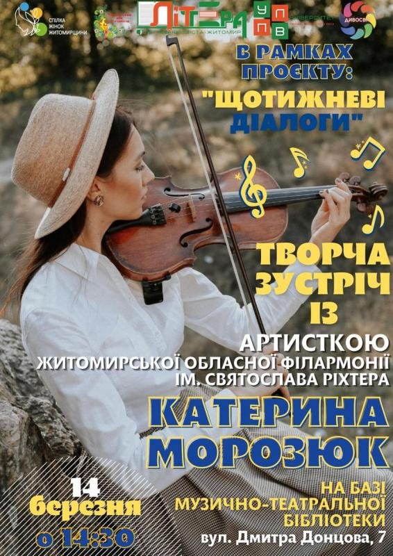 ЛІТтера - бібліотеки міста Житомира запрошують на творчу зустріч із Катериною Морозюк - артисткою Житомирської обласної філармонії ім. С. Ріхтера