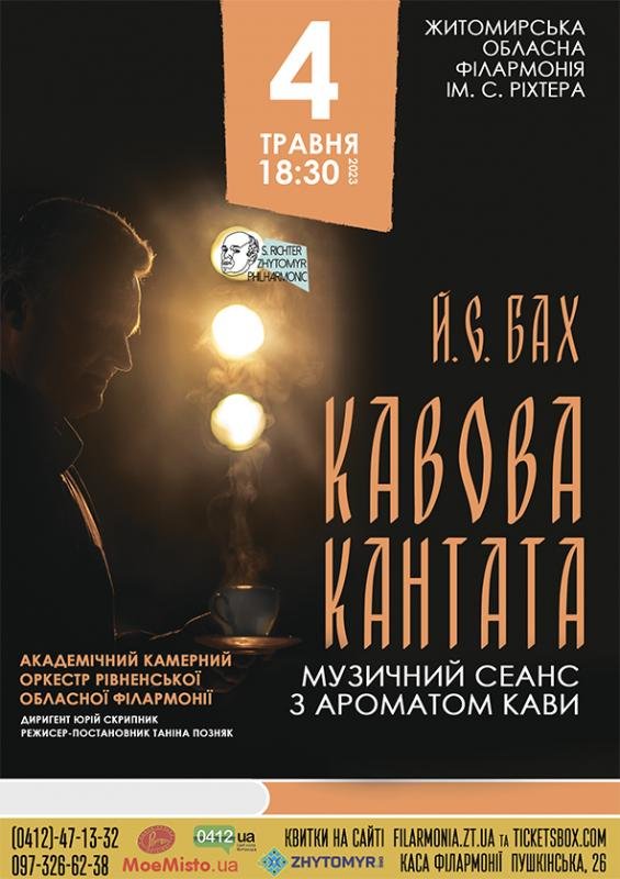 4 травня о 18:30 в Житомирській обласній філармонії ім. С. Ріхтера відбудеться музичне дійство академічного камерного оркестру Рівненської обласної філармонії «Кавова кантата» видатного німецького композитора, органіста і клавесиніста, майстра поліфонії Йоганна Себастьяна Баха.