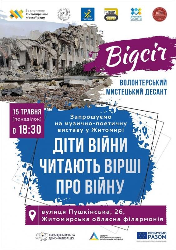 Волонтерський мистецький десант "Відсіч" запрошує вас на Літературно-театральну виставу, яка відбудеться 15 травня (понеділок) о 18:30 в Житомирській обласній філармонії.