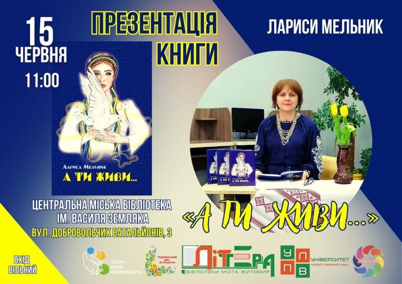 Міські публічні бібліотеки Житомира під брендом "ЛІТтера" запрошують усіх бажаючих насолодитись літературним поетичним словом від полтавської письменниці Лариси Мельник під час презентації авторської поетичної збірки новел і поезій "А ти живи...".